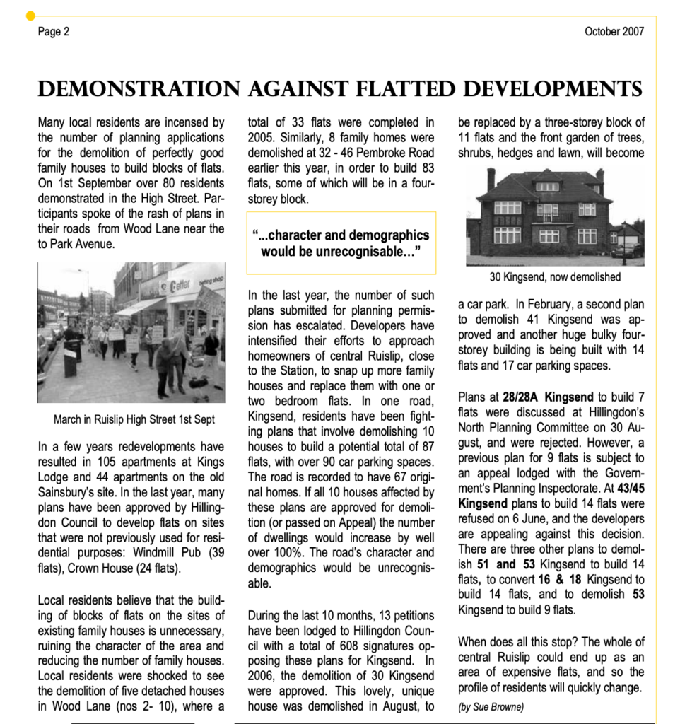 As the news is being absorbed, some people admit that in hindsight they were too complacent and should have made more of an effort to raise their oppositions. They recall the wave of planning proposals to demolish houses in Ruislip between 2006 -2008 that prompted the extension of the Ruislip Village Conservation Area (RVCA) to include roads west of the High Street down to Wood Lane that “should act as a powerful deterrent to approval of some future planning applications.” ( Page 13 from Town Crier February 2009).