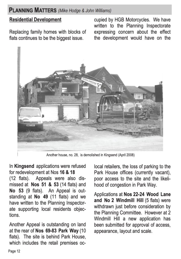 In the past year or so there have been another eight applications in the Kingsend area in which Sue has been heavily involved. Only two of these have been approved which is an indication of what can be achieved when residents are able to respond in a coordinated and constructive manner. We expect the credit crunch will contribute to a respite in the number of applications in the immediate future. However when the economy improves we anticipate developers will revive their interest in the area even though it is now part of the extended Ruislip Village Conservation Area. Ruislip Residents’ Association Town Crier – February 2009