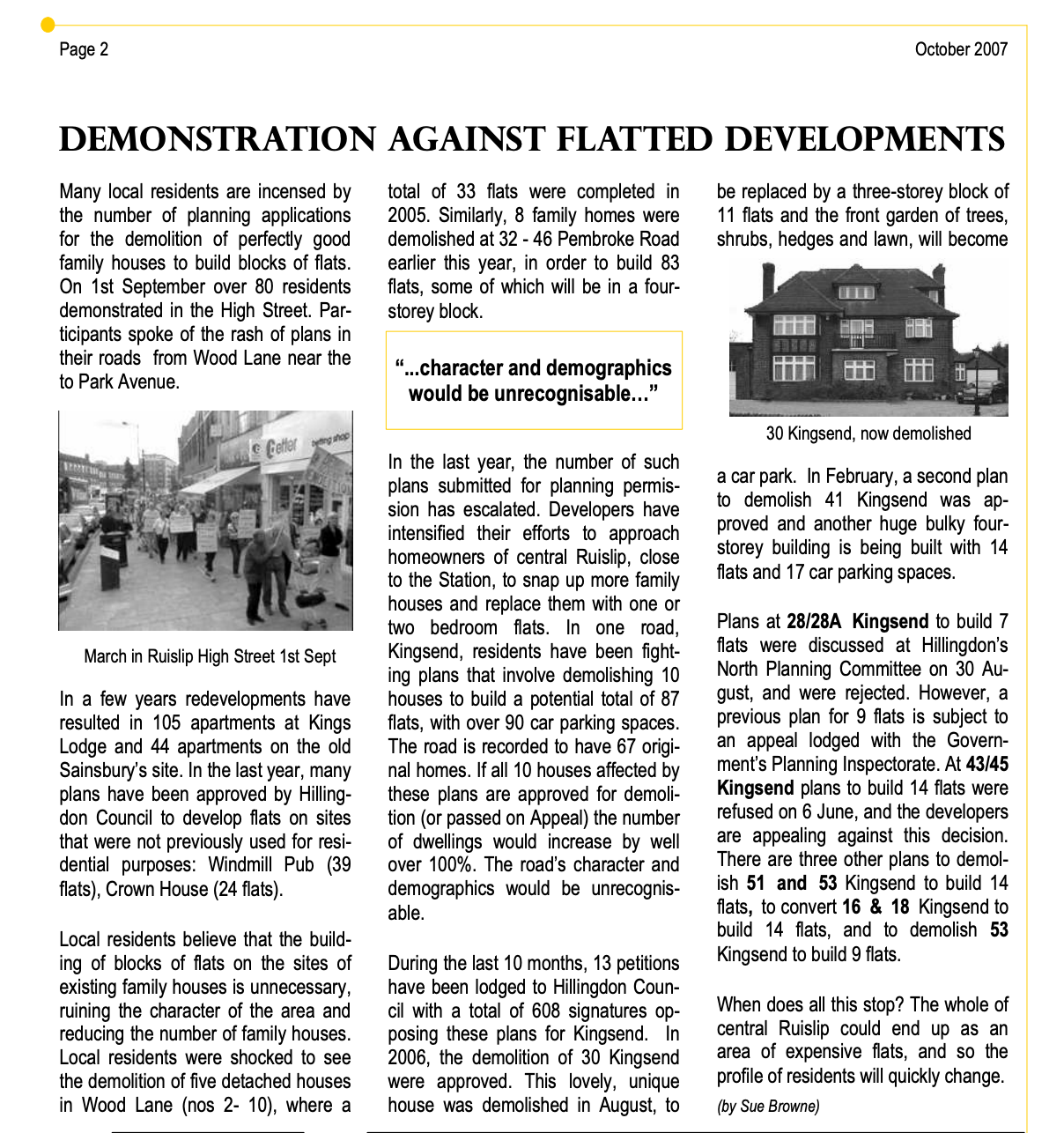 In the past year or so there have been another eight applications in the Kingsend area in which Sue has been heavily involved. Only two of these have been approved which is an indication of what can be achieved when residents are able to respond in a coordinated and constructive manner. We expect the credit crunch will contribute to a respite in the number of applications in the immediate future. However when the economy improves we anticipate developers will revive their interest in the area even though it is now part of the extended Ruislip Village Conservation Area. Ruislip Residents’ Association Town Crier – February 2009