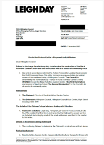 - We write in accordance with the Pre-Action Protocol for Judicial Review under the Civil Procedure Rules. This letter concerns a proposed claim for judicial review of the continued delay of Hillingdon Council (‘The Council’) in determining the nominations by Friends of Rural Activities Garden Centre (‘FRAGC’) to add the Rural Activities Garden Centre (‘the First Nomination) and a parcel of land next door (‘the Second Nomination’) to the Council’s list of assets of community value.