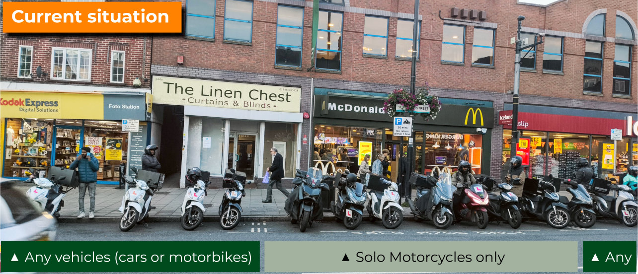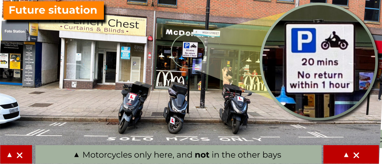 Those two bays have, until now, simply been reserved for motorcycles (ie, unavailable to cars) – but motorcycles have been able to park there, or anywhere else. The UberEats, JustEat and Deliveroo riders have been parking outside McDonald’s in the motorcycle bay, and also spilling out into the car parking spaces either side. If Hillingdon’s plan’s go ahead, that will no longer be possible – the bays will be available only for cars, and motorcycles will have to park either in those two bays or one of the carparks off the high street.