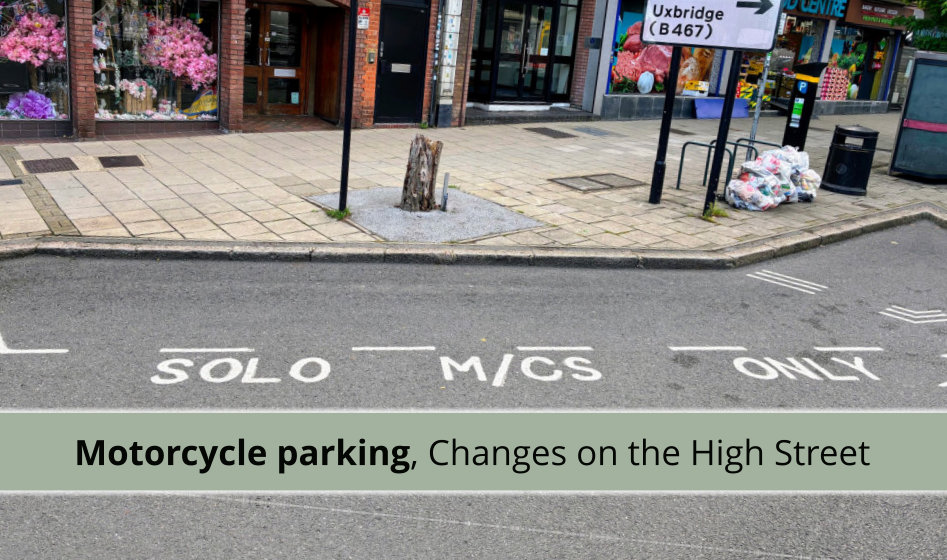 Last month LB Hillingdon ran a public consultation for planned changes over the way that motorcycles can park along Ruislip High Street. Essentially, until now they’ve been able to park in any pay-and-display bay – without charge – and the changes will mean that they can only park in the two bays marked “SOLO M/Cs ONLY”.