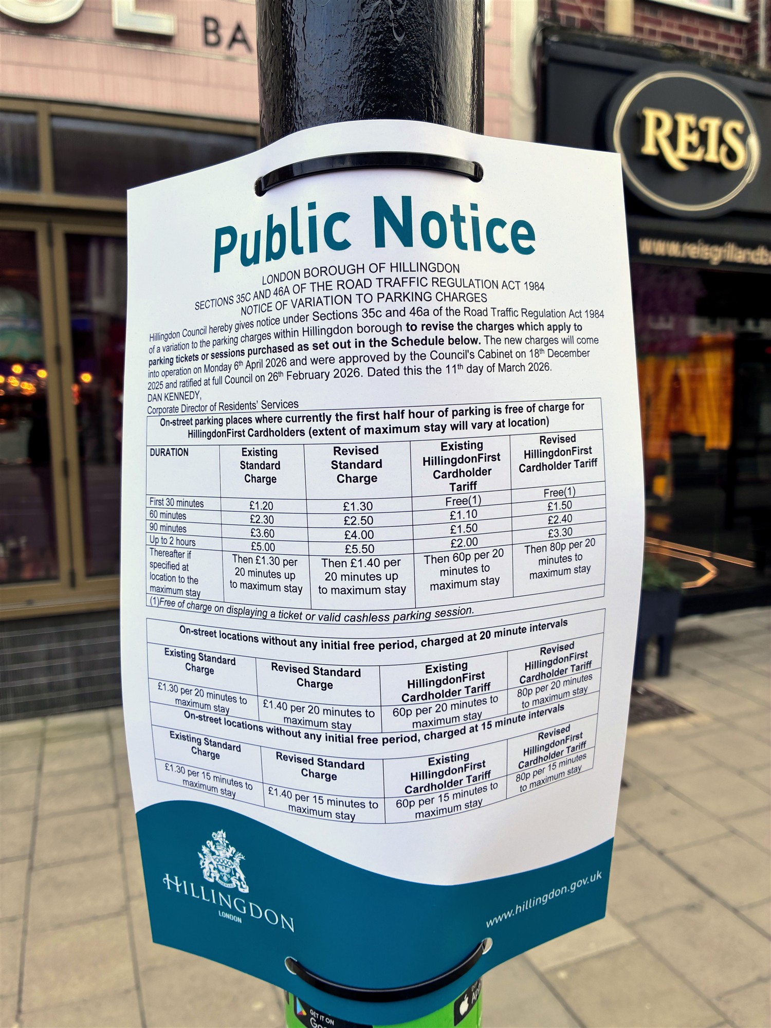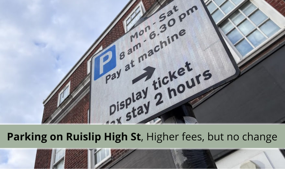 Signs are now in place along Ruislip High Street, dated today, to show the new pricing: parking for upto 90-minutes along the High Street will increase from £1.50 to £2.40 for residents with a HillingdonFirst card (and £4.00 for visitors without one).