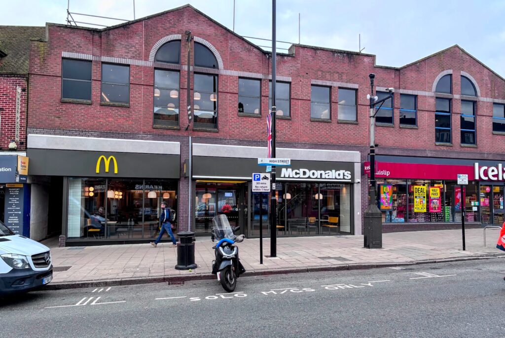The McDonald’s restaurant had few tables and chairs because there was a large collection area inside for UberEats, JustEat, and Deliveroo riders. The redevelopment work at McDonald’s was to extend into the old shop next door and to return the restaurant to being a restaurant: delivery riders now pick up their orders from a collection point around the back, facing into the carpark.