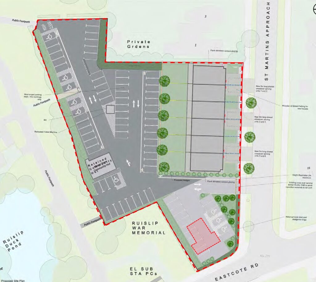 Vehicle access to the car park would remain from St Martin’s Approach, although the entrance would be repositioned further south. No access is proposed from Eastcote Road. Existing pedestrian routes between St Martin’s Approach and Manor Farm are shown as being retained.