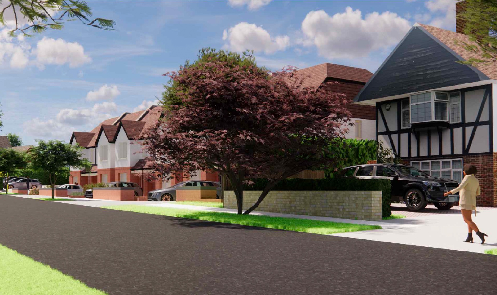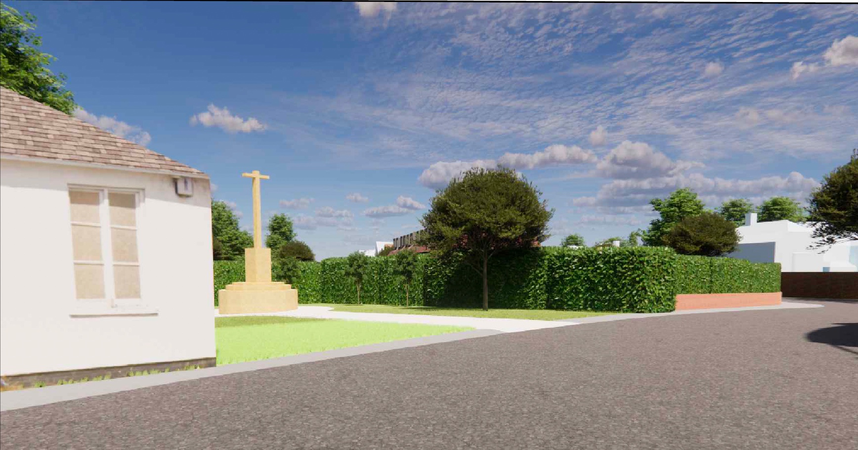 Proposed View from Eastcote Road: This computer-generated image shows the relationship between the War Memorial and the six new 2.5-storey houses intended for the current car park site